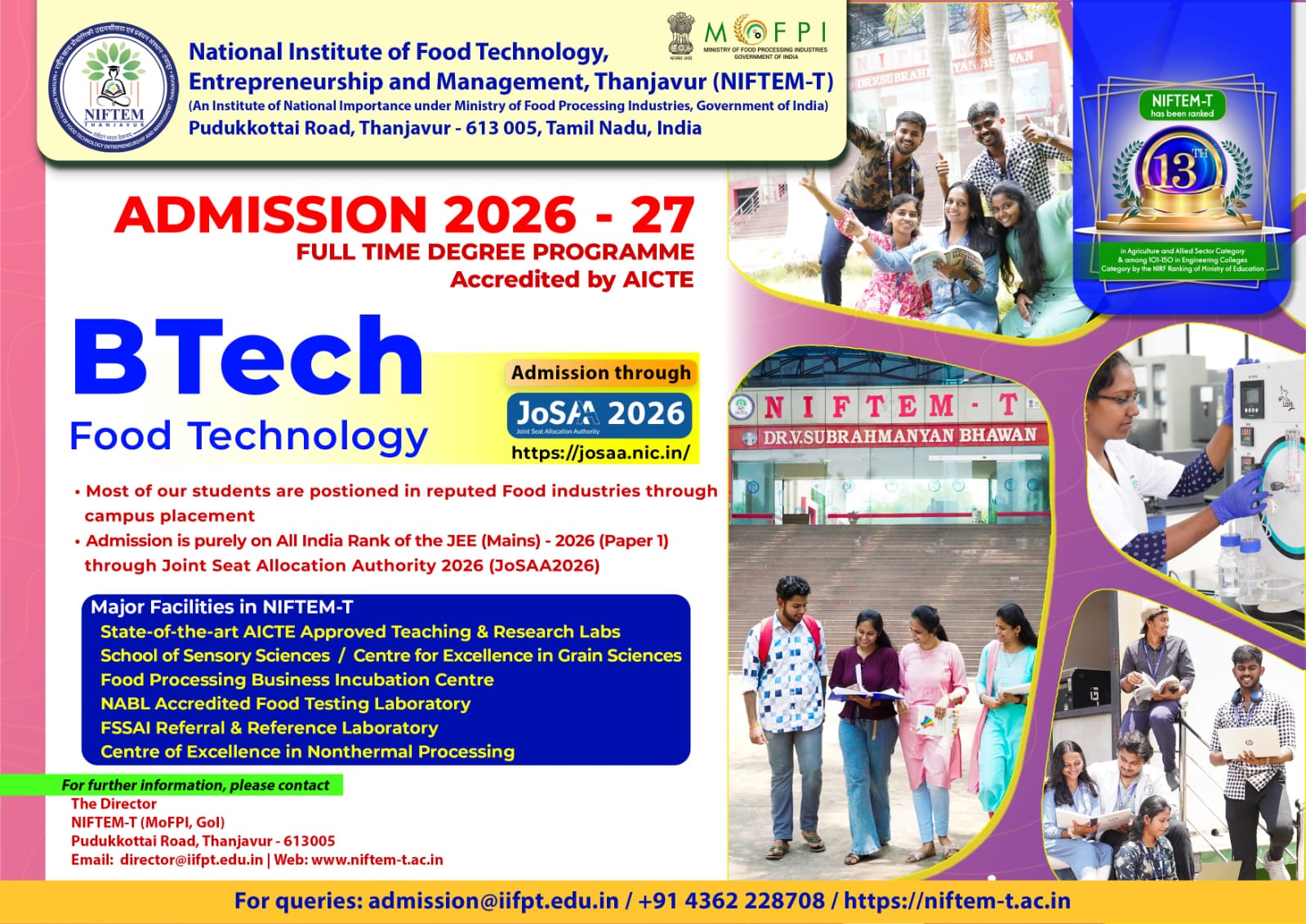 Click Here for Advisory for JEE (Main) - 2026 Aspirants Click Here for JEE (Main) 2026 Registration portal Click Here for B. Tech. (Food Technology) Academic Prospectus 2025 - 2026