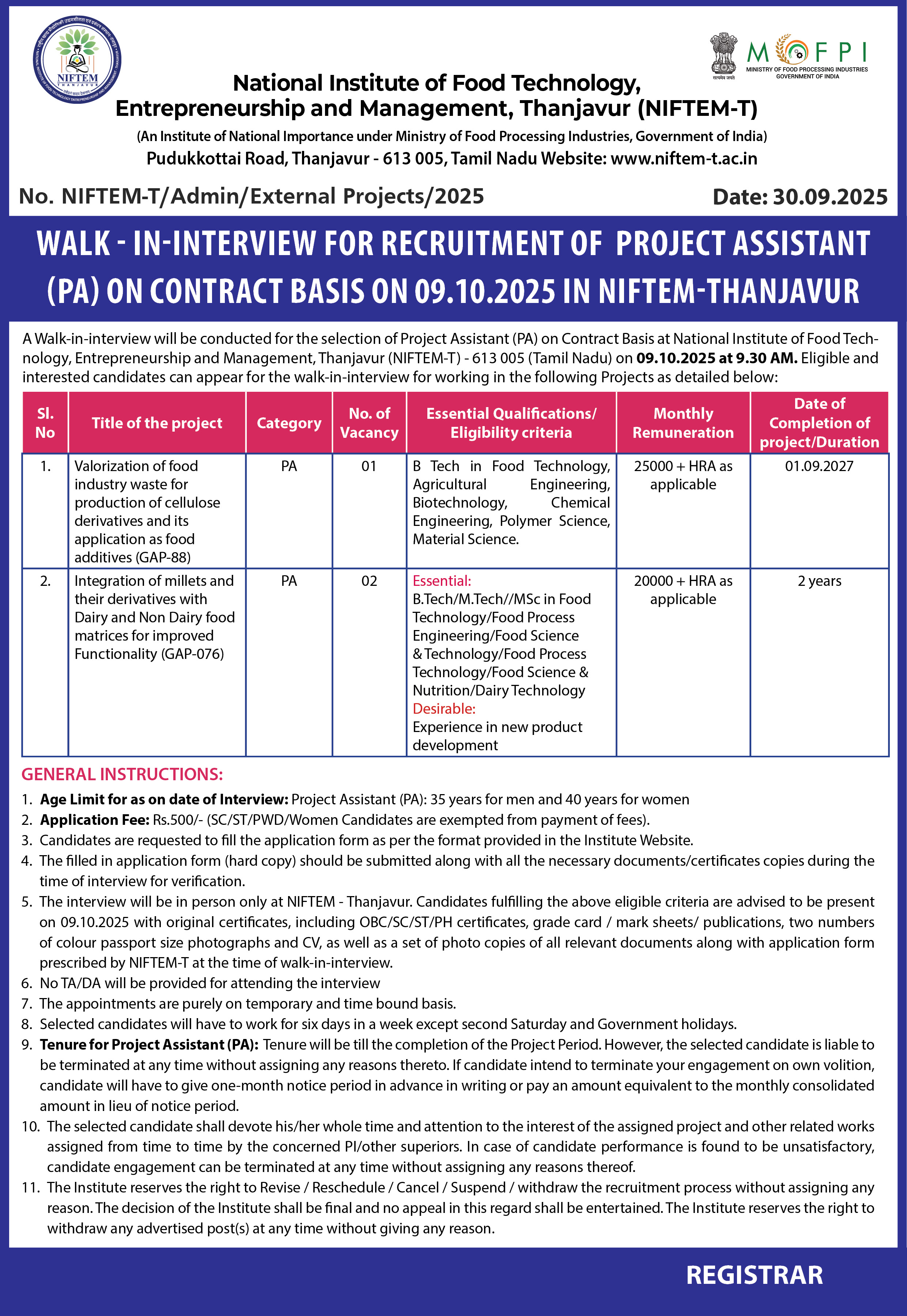 Walk - In-Interview for Recruitment of Project Assistant (PA) on Contract Basis on 09.10.2025 in NIFTEM-THANJAVUR