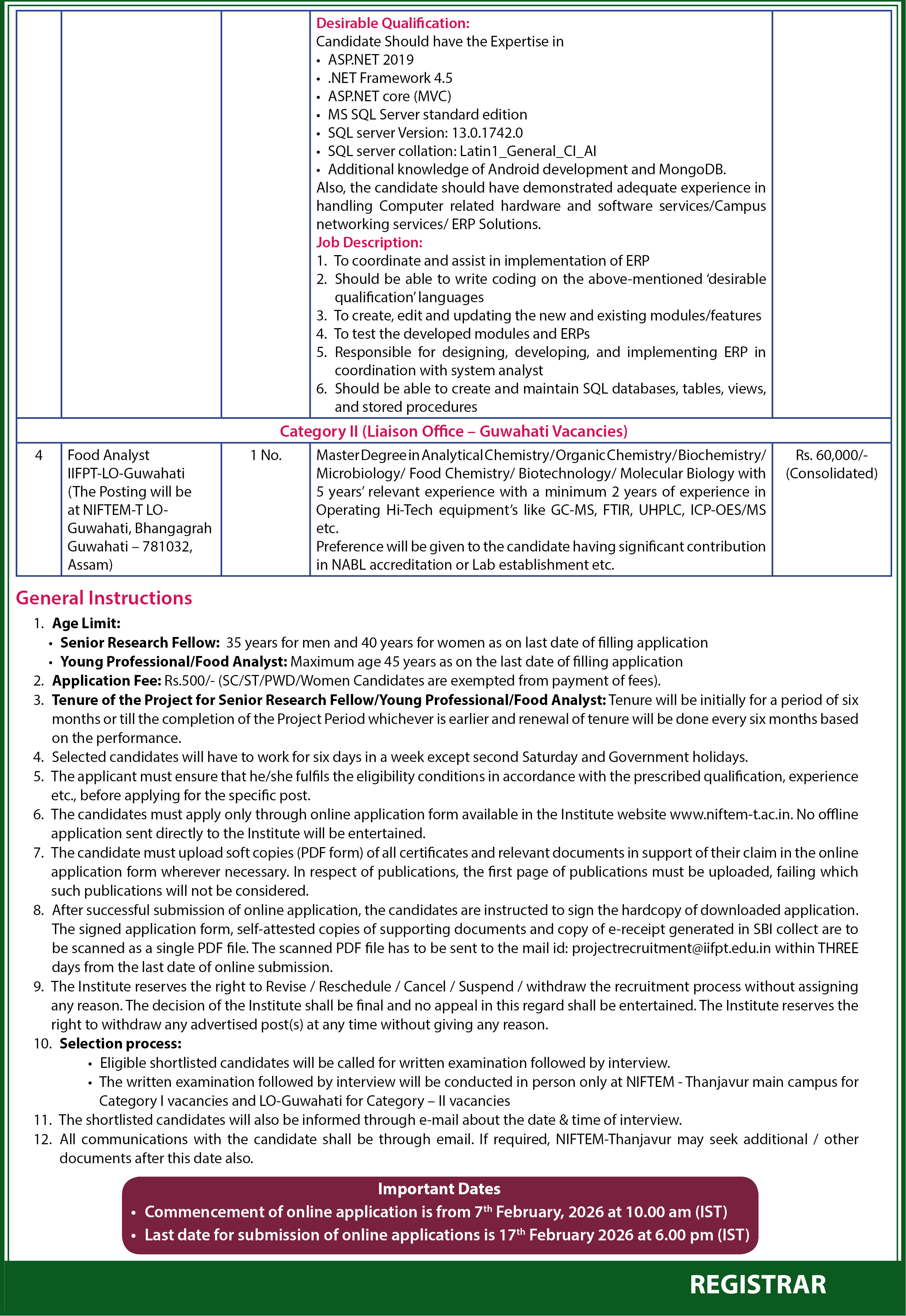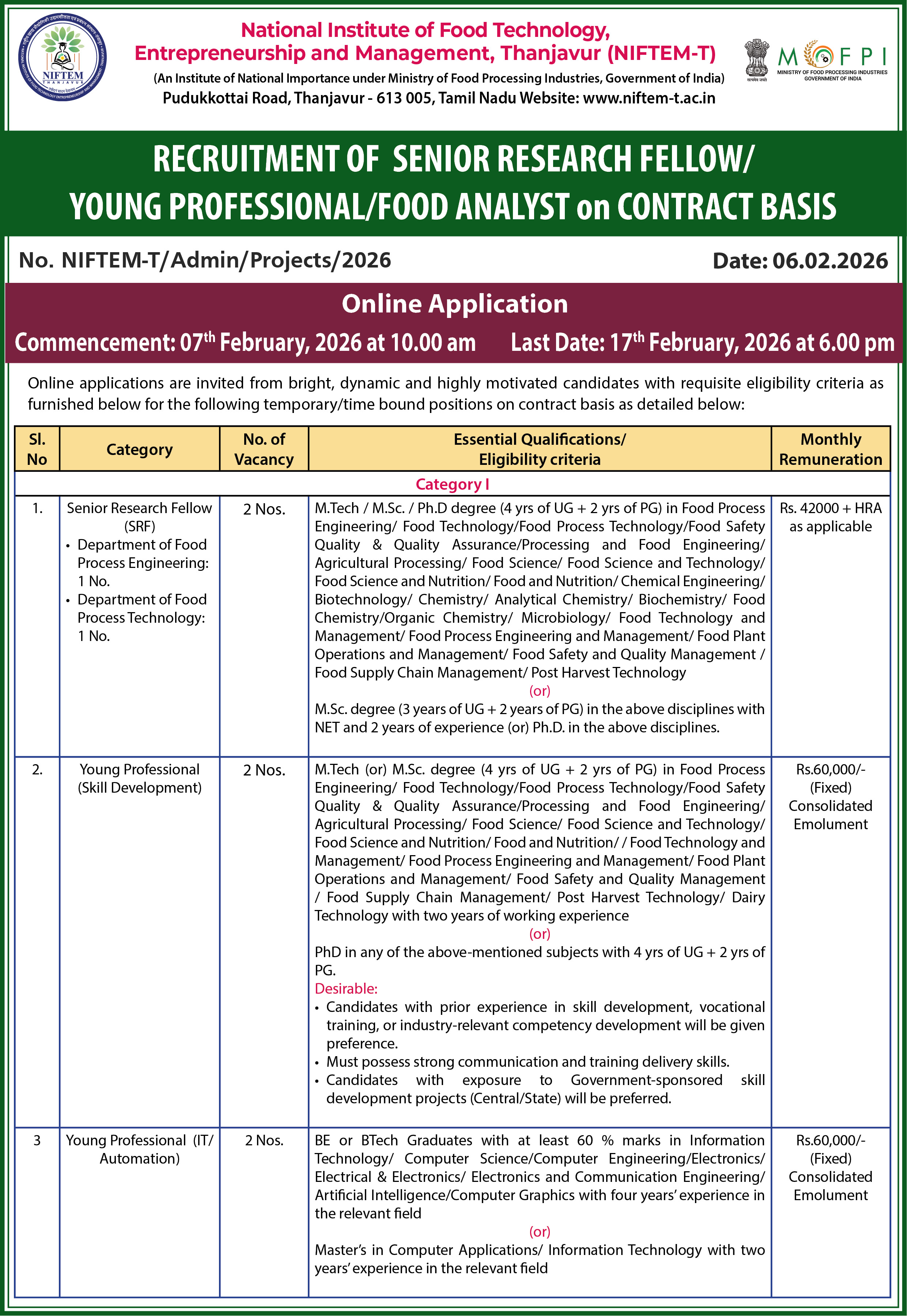 NIFTEM - Thanjavur - Recruitment of Senior Research Fellow/Young Professional/Food Analyst on Contract Basis