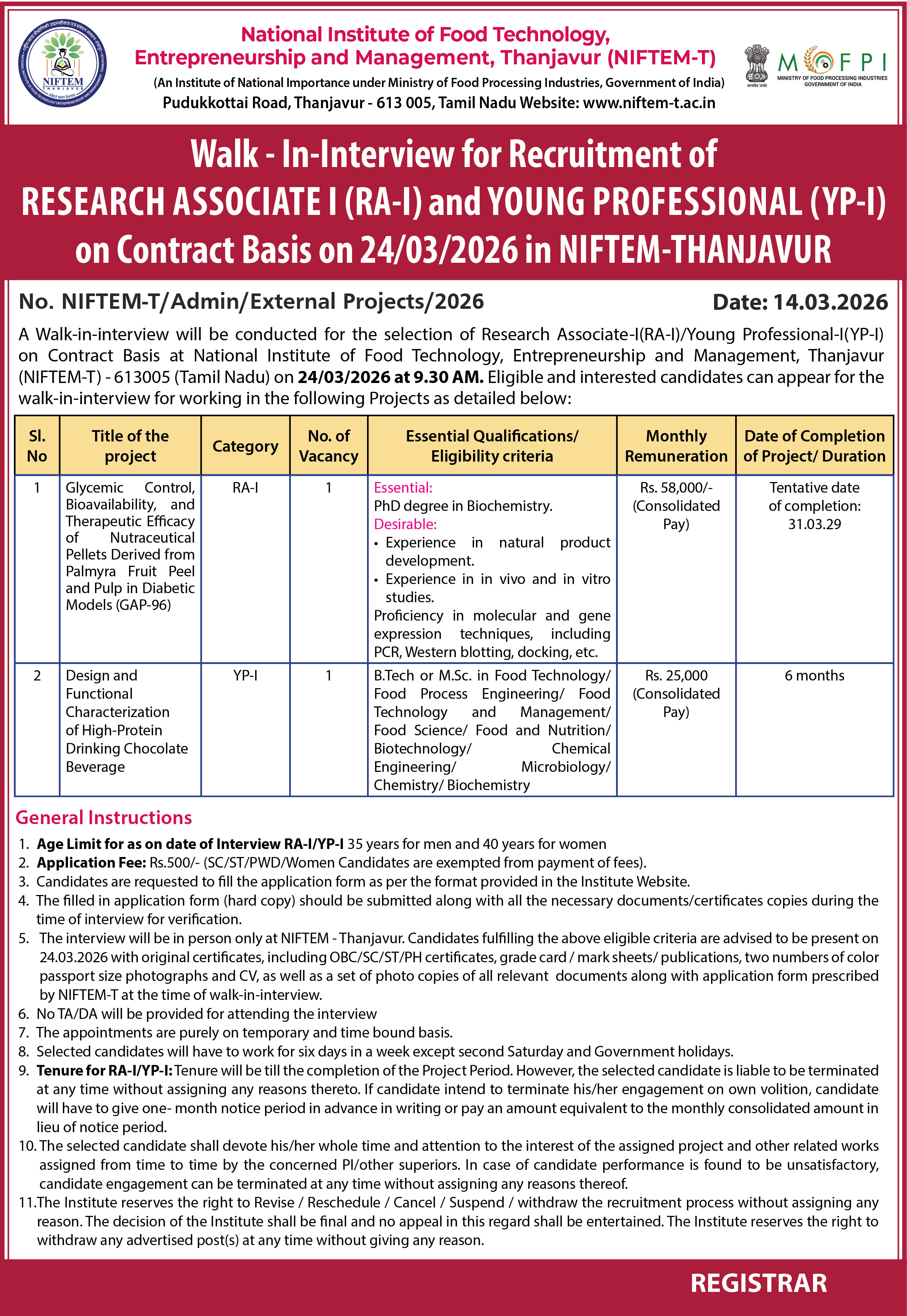 Walk - In-Interview for Recruitment of Research Associate I (RA-I) and Young Professional (YP-I) on Contract Basis on 24/03/2026 in NIFTEM-THANJAVUR